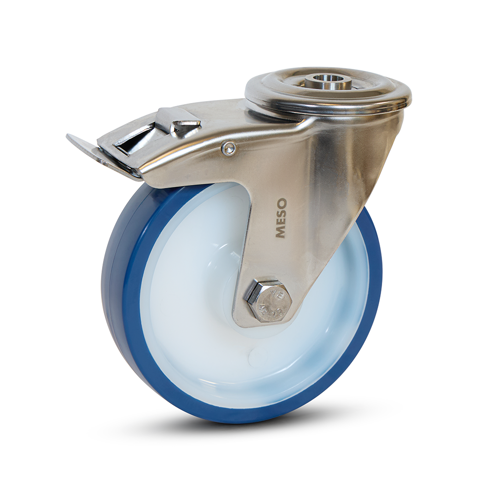 Ruota girevole frenata con foro per bulloni, pneumatico in PU blu e forcella in acciaio inox. 125 mm, 220 kg. Compatta e sicura.