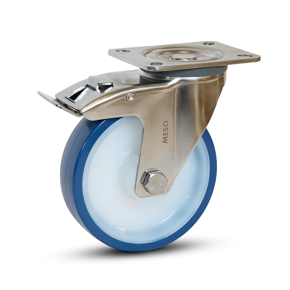 Ruota girevole in acciaio inox con freno e piastra superiore. Battistrada in PU blu, dimensione ruota 125 mm, capacità di carico fino a 220 kg. Per un uso stabile in ambienti umidi.