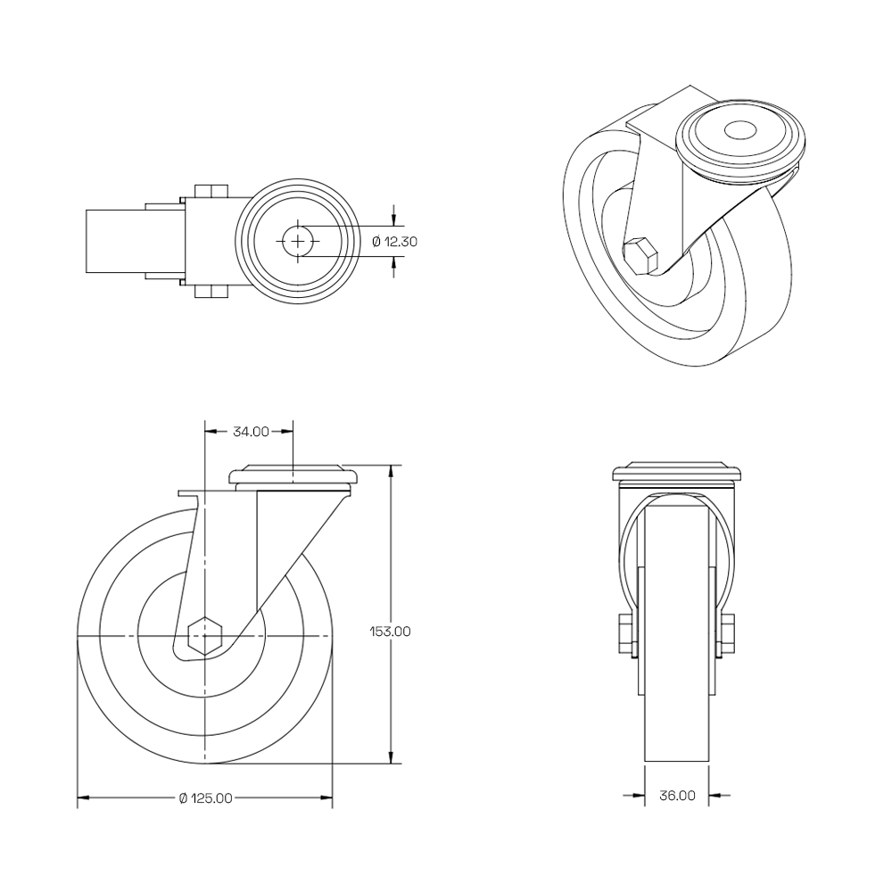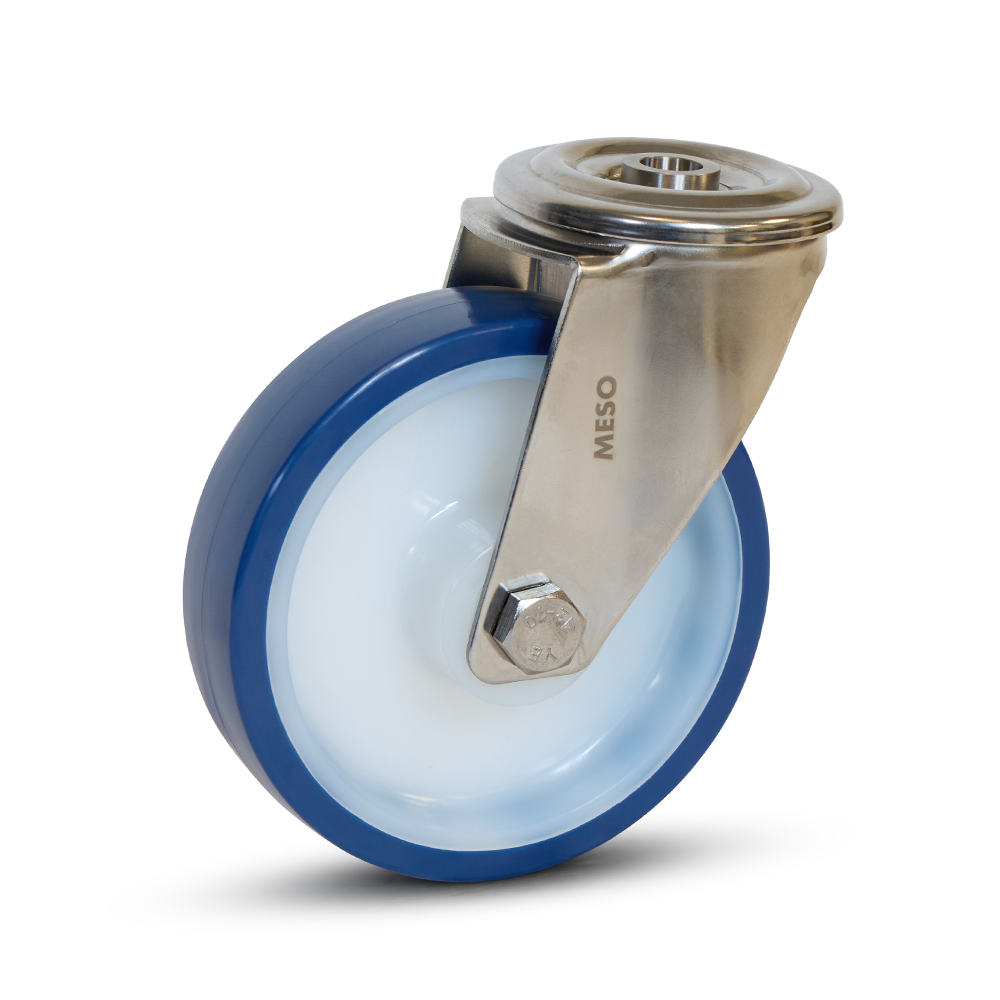Ruota girevole con bullone centrale, forcella in acciaio inox e pneumatico in PU blu. 125 mm, 220 kg. Ideale per il fissaggio compatto.