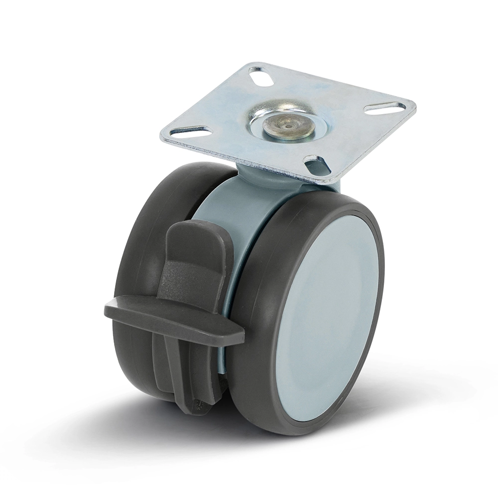 Doppia ruota girevole grigia per mobili, frenata con piastra superiore - 75mm - 80kg