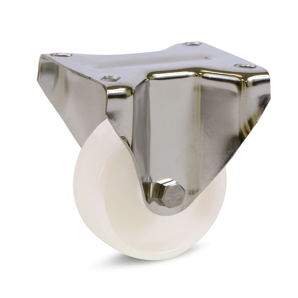 Ruota resistente per montaggio fisso. La combinazione di forcella in acciaio inox e ruota in nylon rende questa ruota perfetta per gli ambienti igienici e umidi.