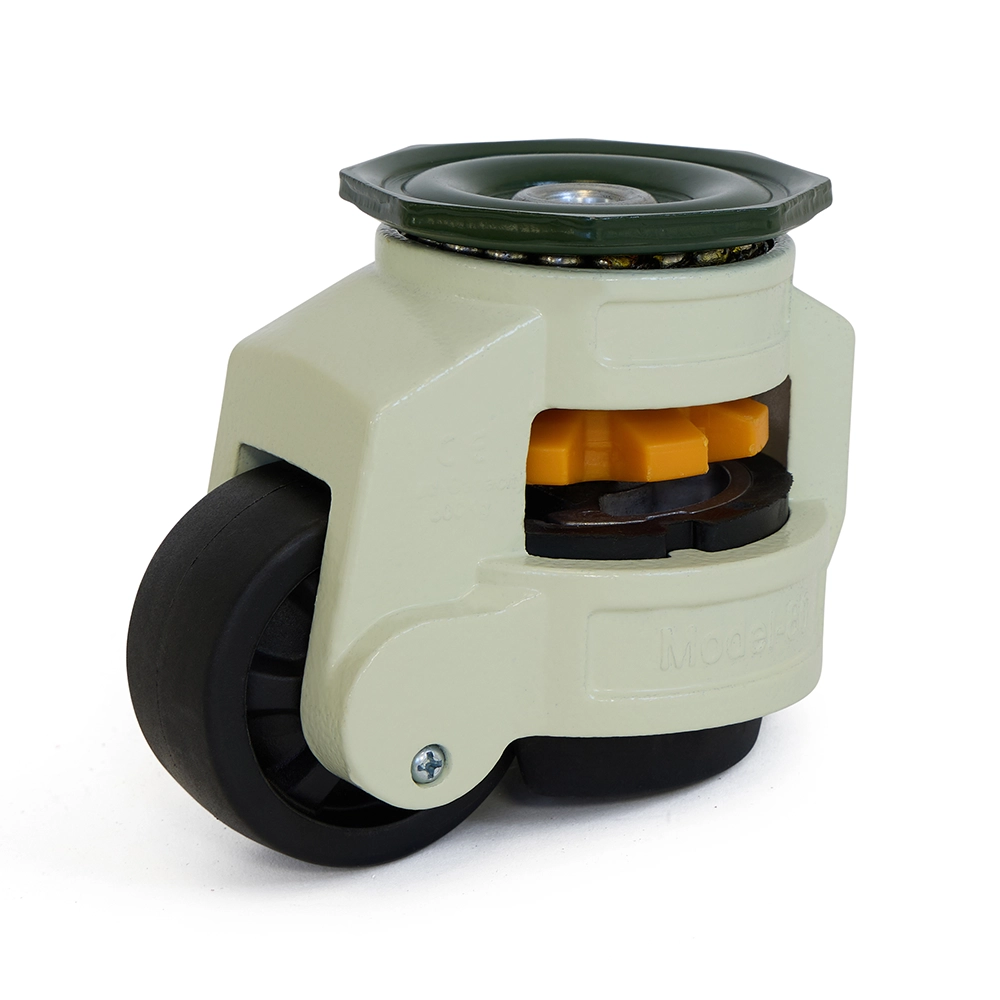 Questa ruota di sollevamento è dotata di un potente meccanismo di sollevamento. Quando viene sollevata, la ruota si stacca completamente dalla superficie, mantenendo stabile l'applicazione. Ciò rende questa ruota ideale per le strutture e le applicazioni pesanti che devono essere spostate in modo flessibile e posizionate in modo stabile senza l'uso di un freno.